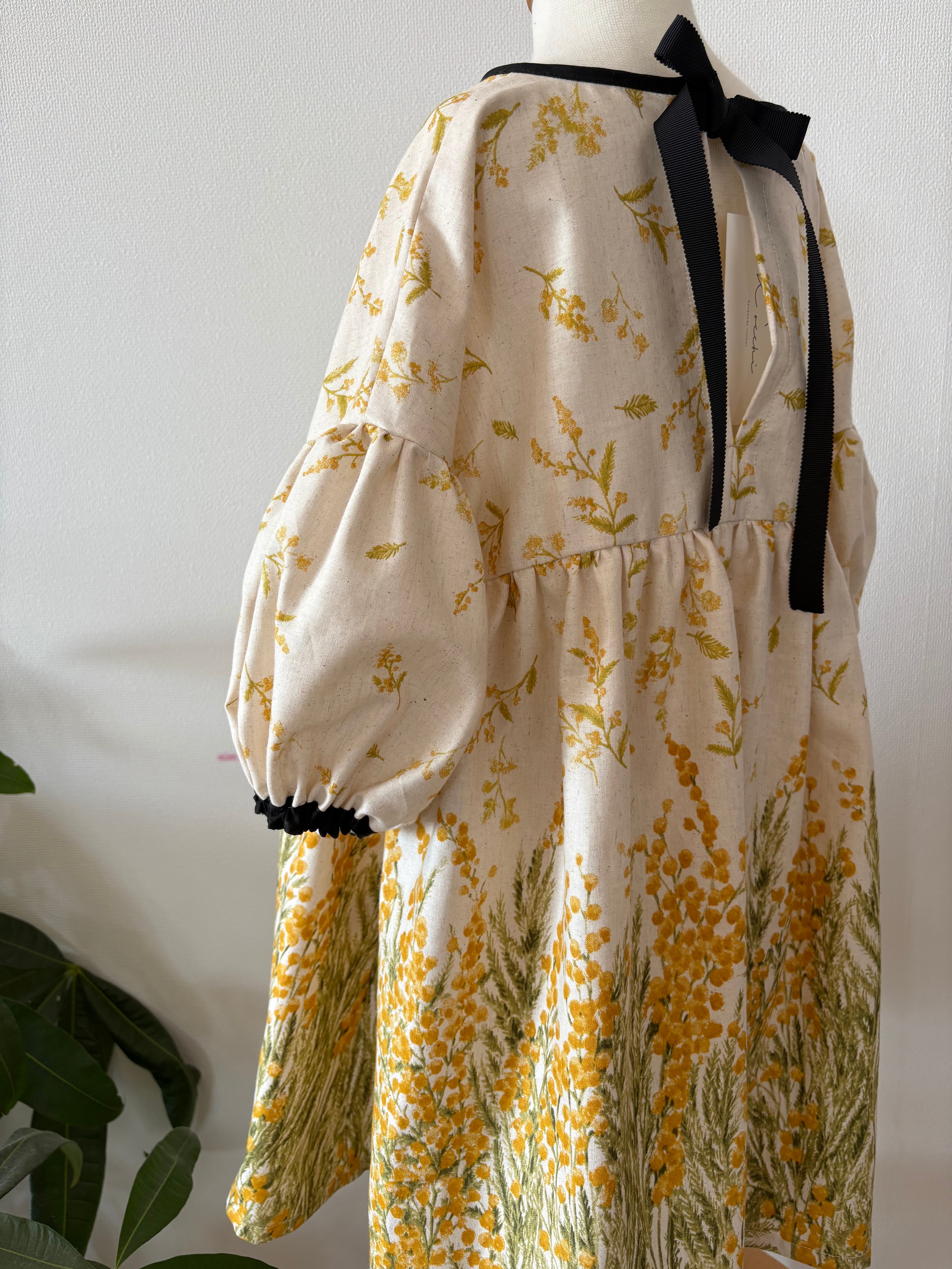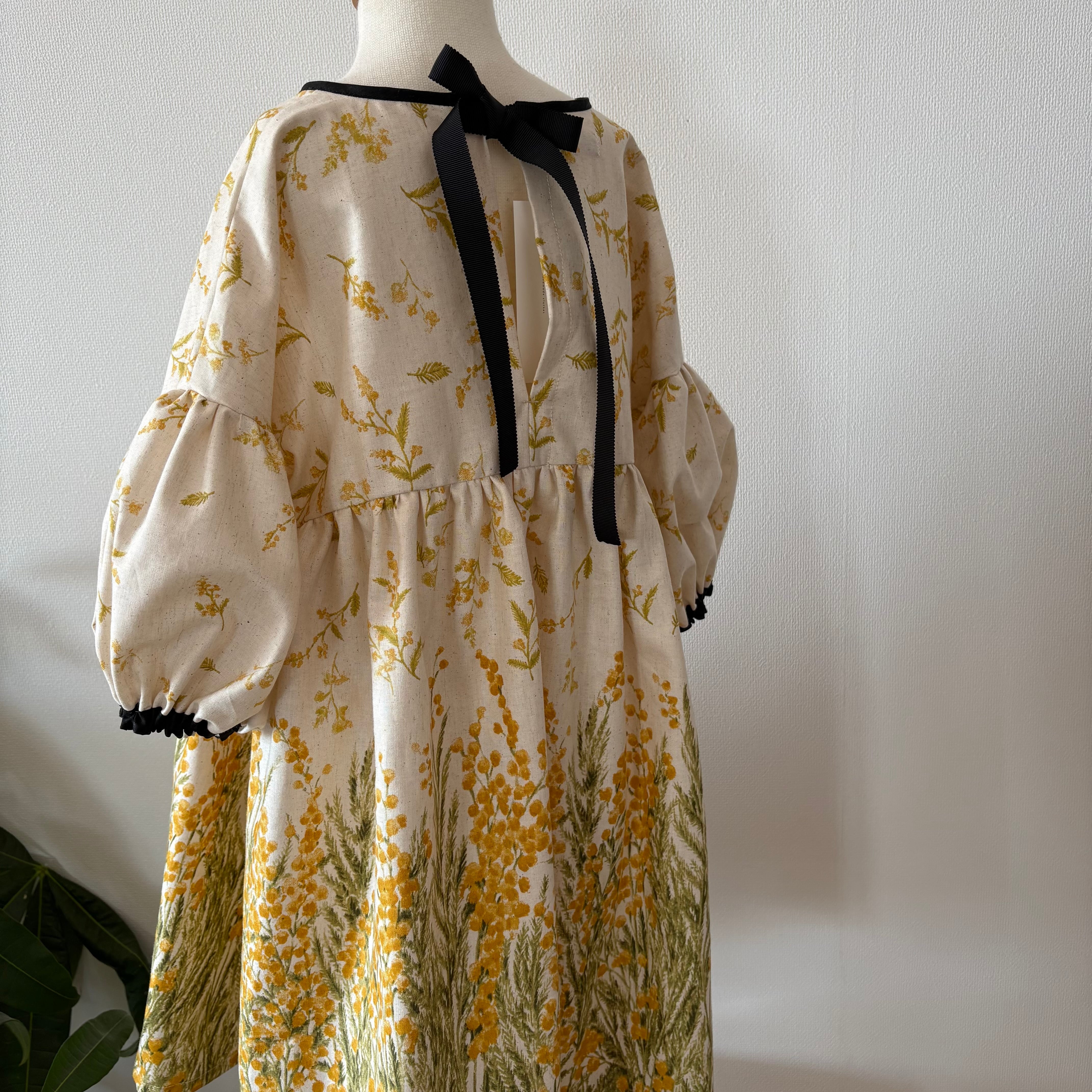 春の訪れを演出するミモザのぽわん袖ワンピース